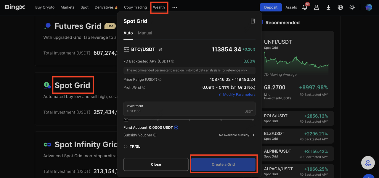Os mercados laterais e com movimentos de sobe e desce são ideais para o trading de grade. A BingX oferece bots de grade Spot e de Futuros para ajudá-lo a negociar automaticamente. Veja como começar: