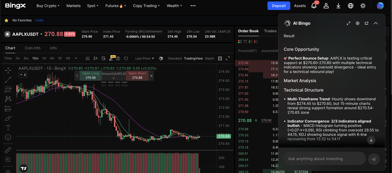 7. Monitore sua posição usando os insights da BingX AI para AAPLX para rastrear a força da tendência, volatilidade e níveis-chave antes de ajustar ou fechar a negociação.