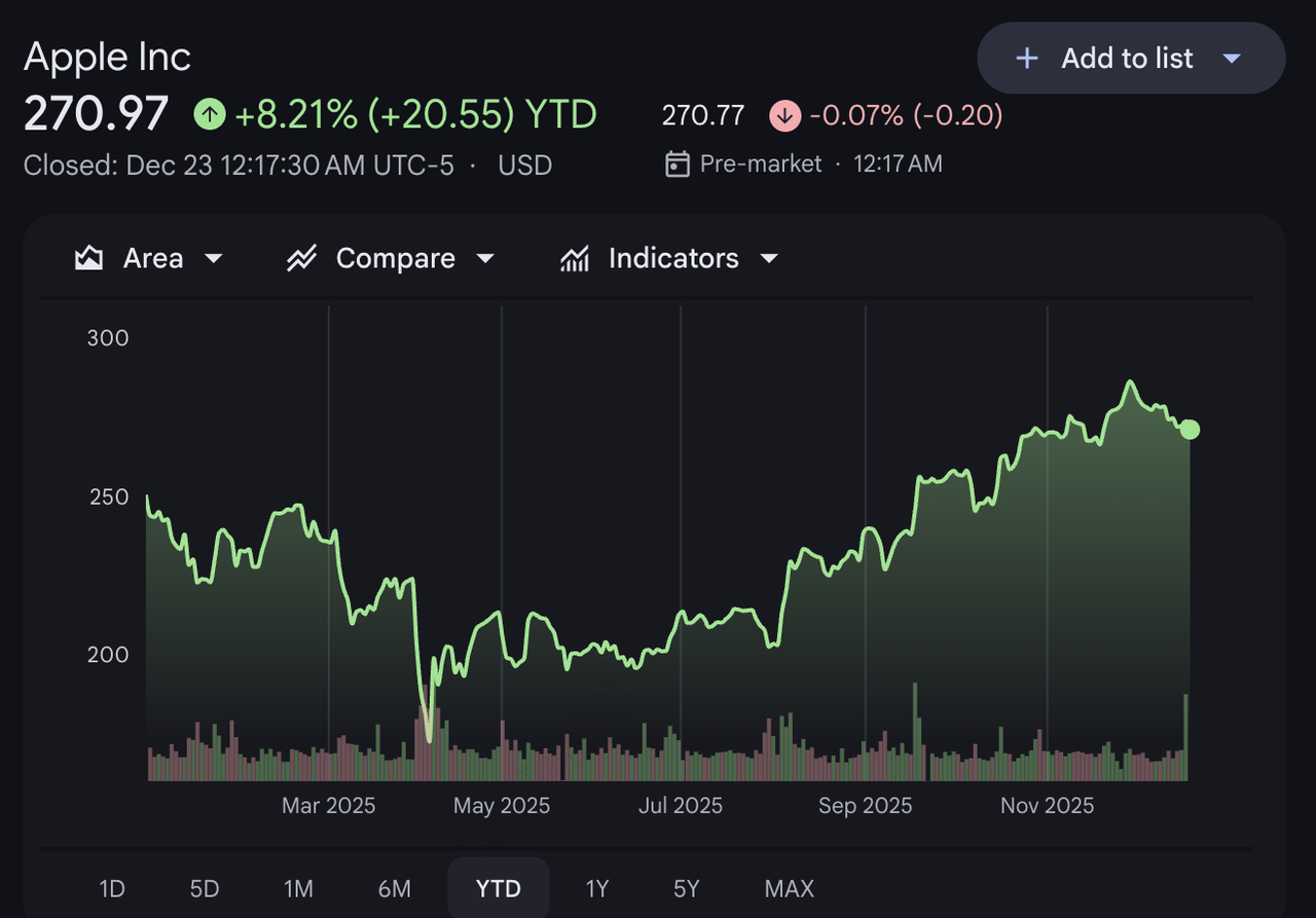 NVIDIA, a Apple Inc. continua a ancorar os mercados globais de ações. No final de dezembro de 2025, as ações da Apple eram negociadas perto de US$ 271, com alta de mais de 8% no acumulado do ano, refletindo a confiança sustentada dos investidores impulsionada pelo ecossistema do iPhone, Apple Silicon e um negócio de serviços de alta margem que abrange a App Store, iCloud e Apple Pay.