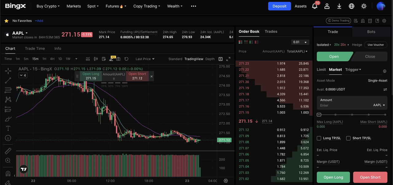 Você pode comprar e negociar ações tokenizadas da Apple na BingX, que suporta ações tokenizadas nos mercados spot e de derivativos, com a