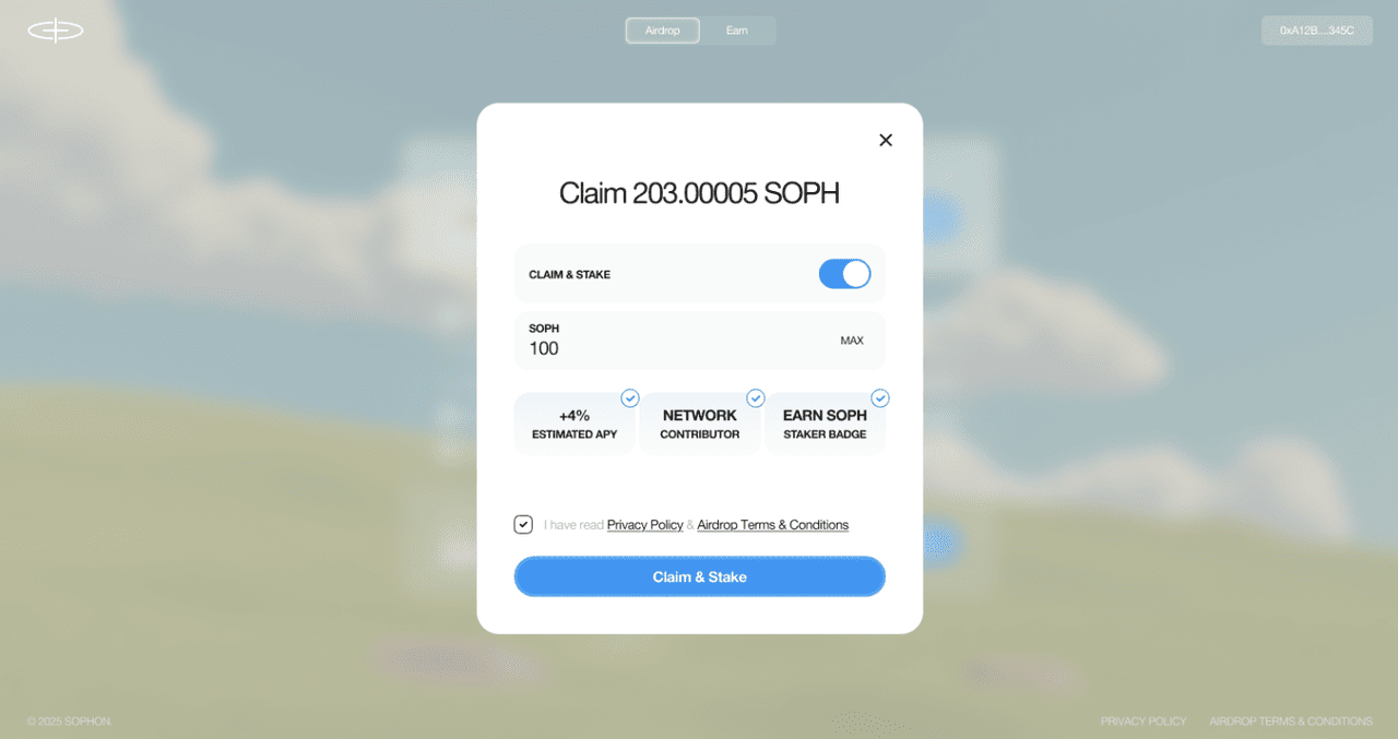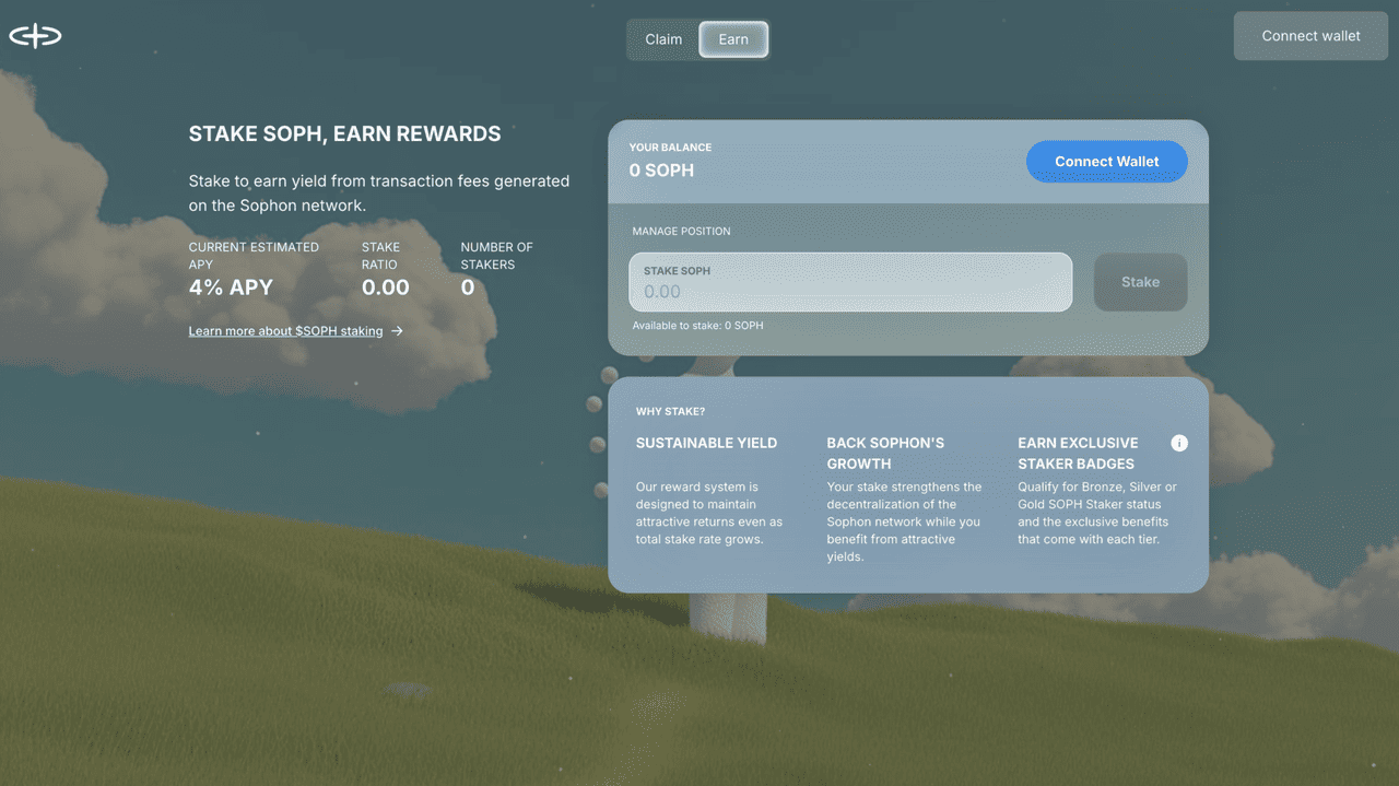 Passo 2: Revise e confirme sua reivindicação ou staking Após se conectar, verifique sua alocação de SOPH. Você pode reivindicar seus tokens diretamente ou escolher stak uma parte para ganhar recompensas do protocolo e desbloquear badges de staking: