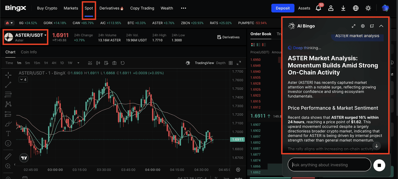 ASTER/USDT trading pair on the spot market powered by AI Bingo