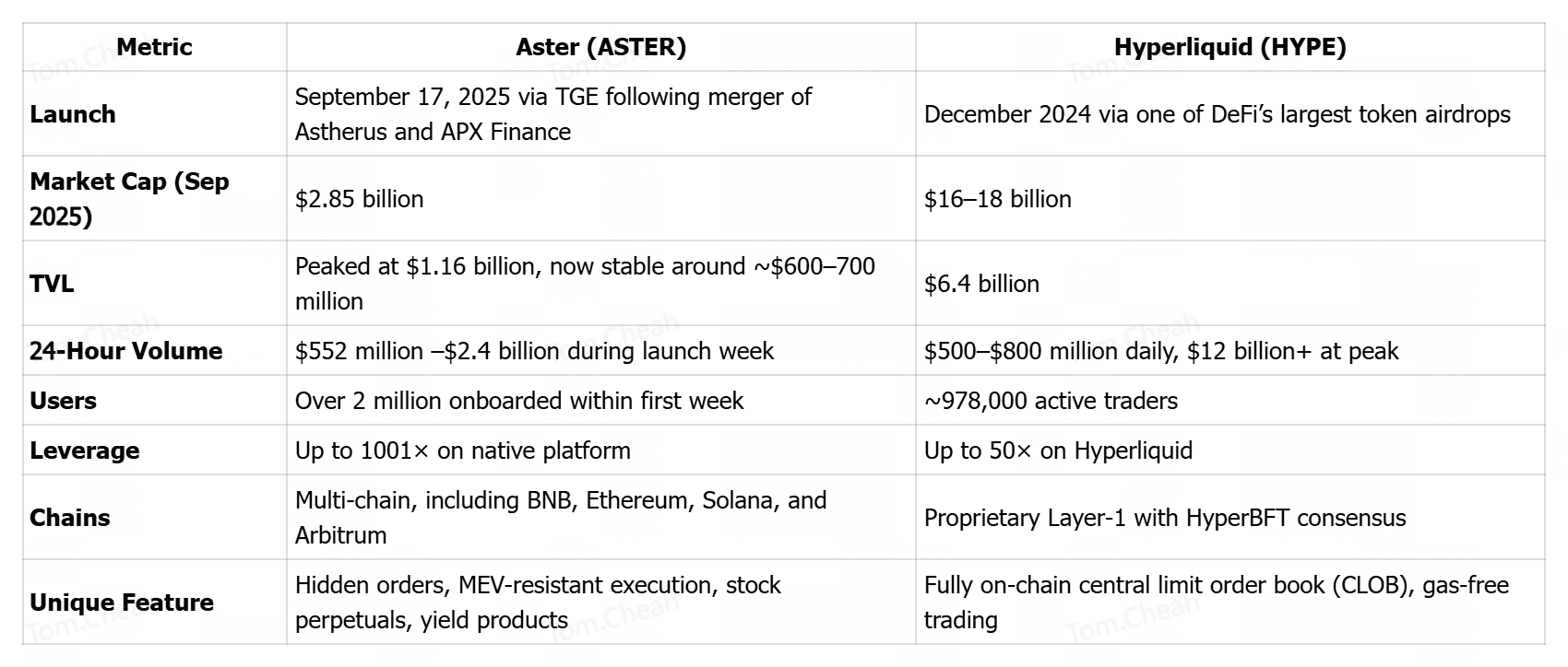 ASTER powers a multi-chain DEX with strong airdrop-driven distribution, while HYPE is tied to a custom Layer-1 with deflationary buybacks. ASTER emphasizes growth incentives; HYPE emphasizes sustainability.