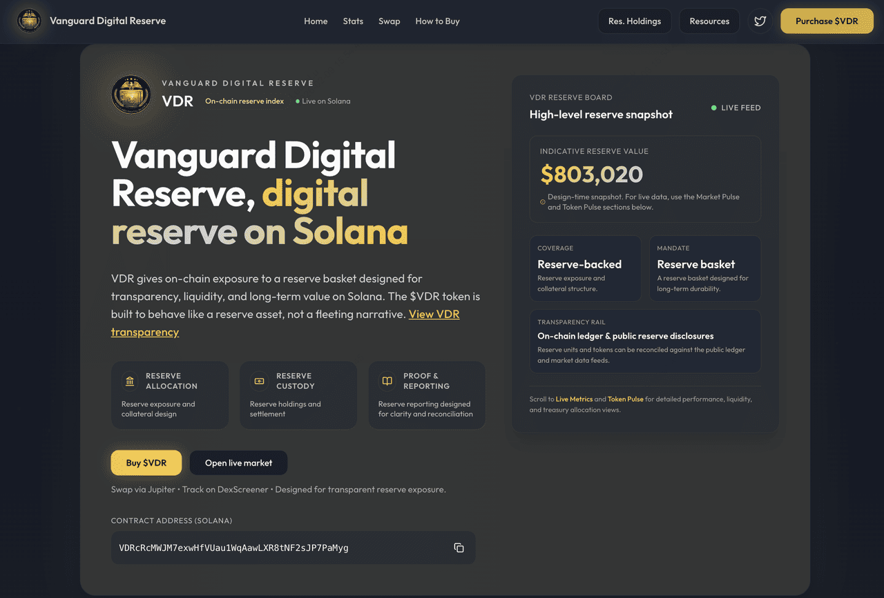 monedelor meme. În loc să se bazeze pe umorul de pe internet, VDR folosește limbajul vizual și tonul autoritar al instituțiilor financiare tradiționale pentru a construi o comunitate bazată pe narațiune. Construit pe blockchain-ul Solana pentru execuție de mare viteză, se poziționează ca un "index de rezervă on-chain", deși investitorii ar trebui să abordeze proiectul cu o perspectivă analitică având în vedere natura sa hibridă și dezvoltarea în stadiu incipient.