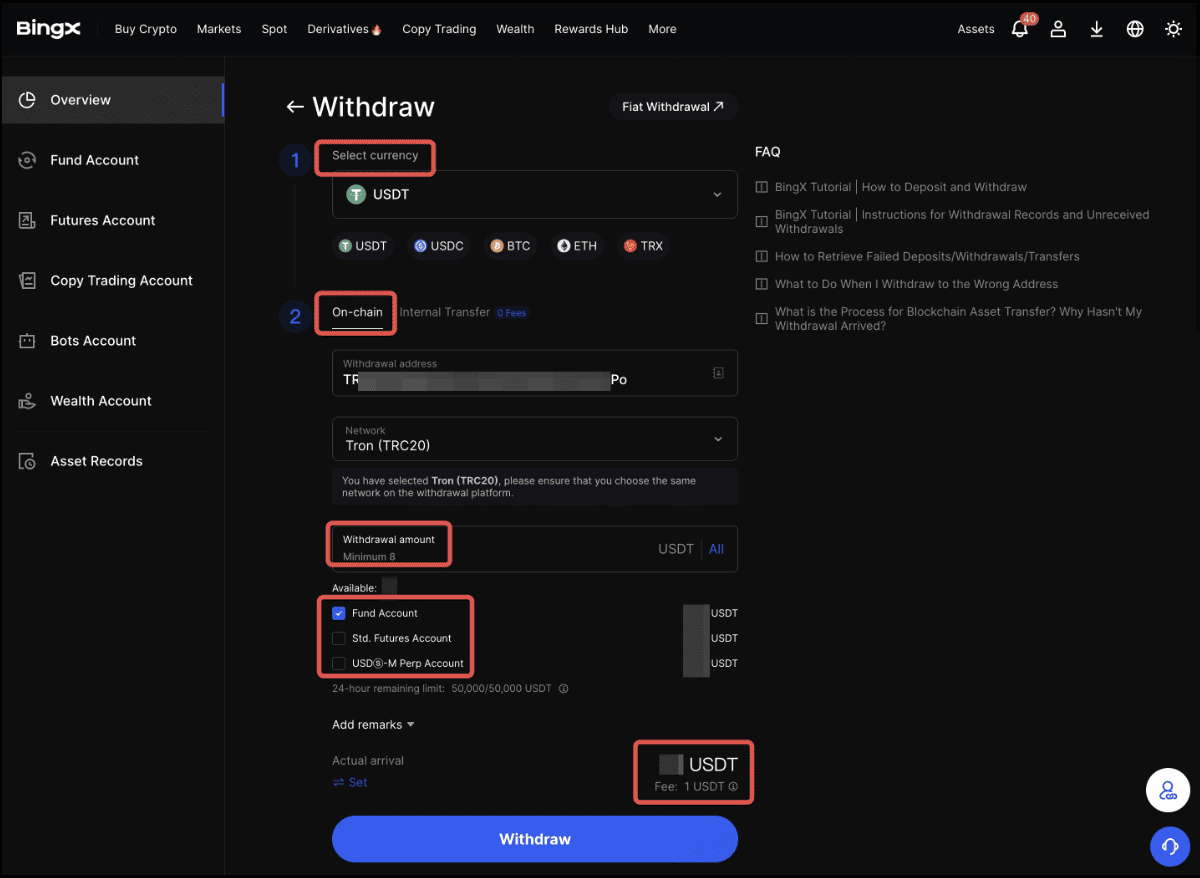 1. Mergeți la pagina dvs. BingX Assets și dați click pe Withdraw.