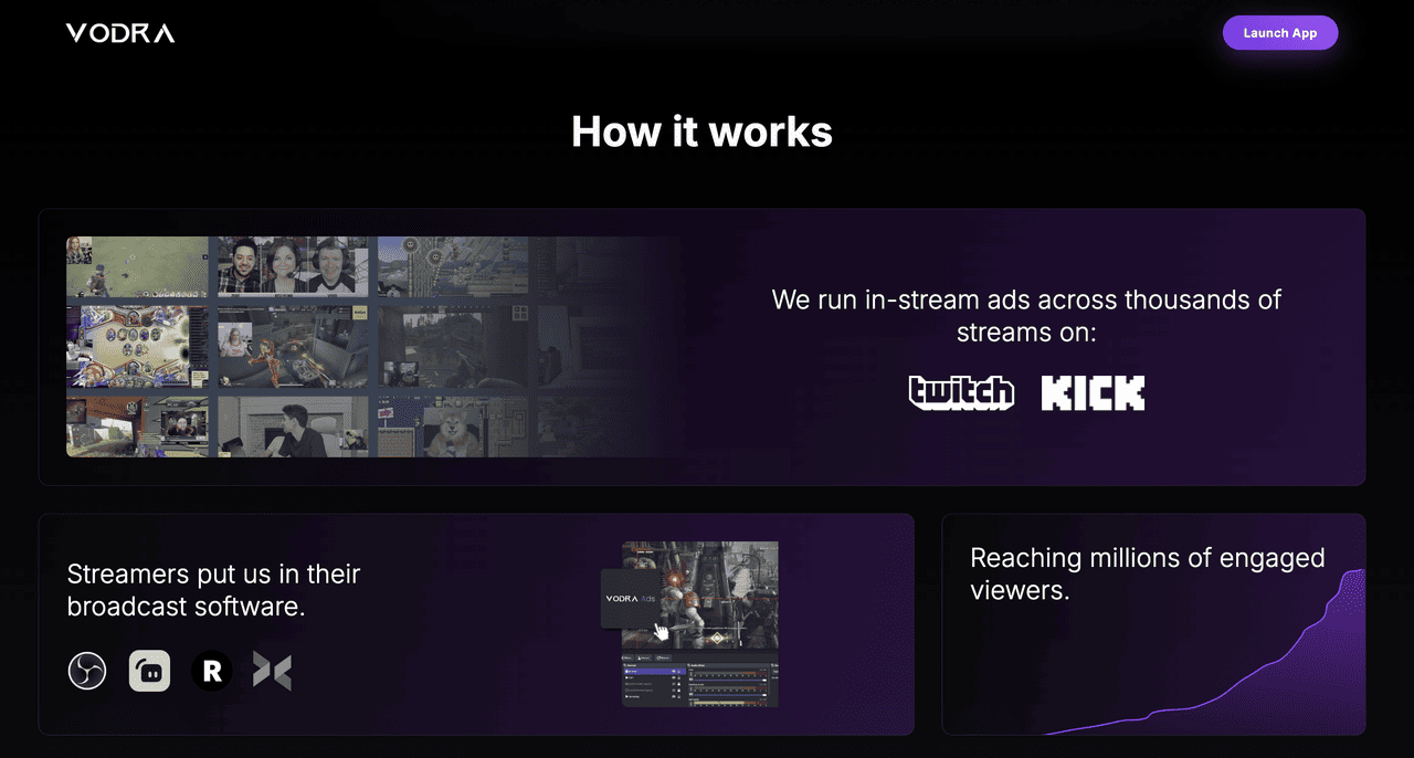 Vodra este o platformă peer-to-peer de donații și publicitate care conectează creatorii de conținut direct cu audiențele și mărcile lor. Spre deosebire de rețelele de reclame tradiționale care se bazează pe overlay-uri specifice platformei (care pot fi blocate de ad-blocker-e), Vodra oferă o soluție agnostică la platformă. Funcționează fără probleme pe Twitch, Kick, YouTube Live și X (fostul Twitter), oferind creatorilor proprietatea completă asupra fluxurilor lor de venituri.