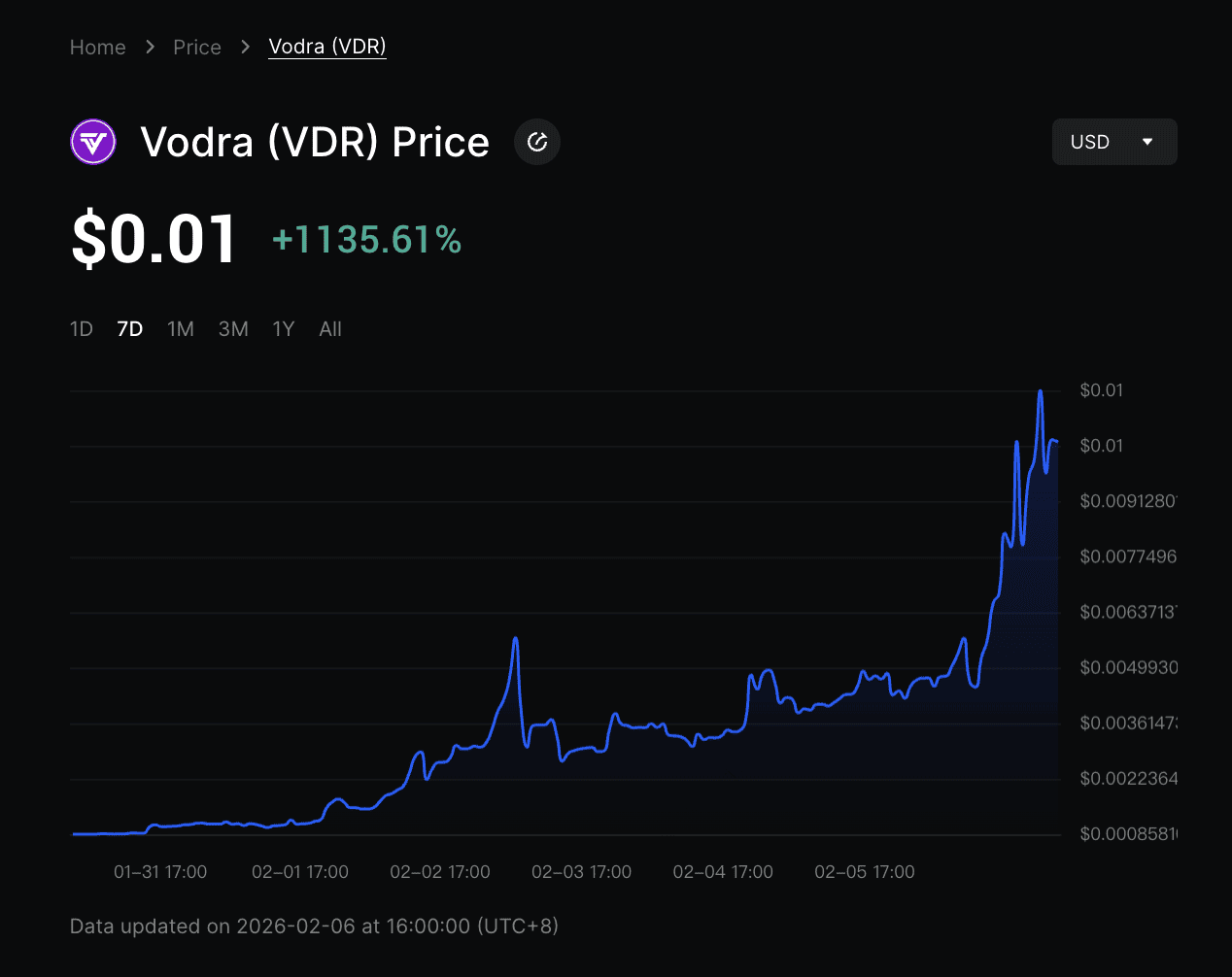 3. Rotația Solana și Breakout-ul (2-6 februarie 2026): În urma actualizărilor fundamentale, VDR a devenit o țintă principală pentru capitalul care se rotea în ecosistemul Solana. Token-ul a depășit nivelurile cheie de rezistență pe 2 februarie, catalizând o creștere de o săptămână care a culminat cu depășirea barierei psihologice de 0,01 USD pe 6 februarie.