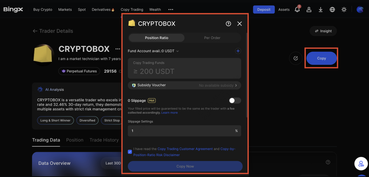 На профиле трейдера → нажмите Копировать, чтобы войти на страницу настроек.