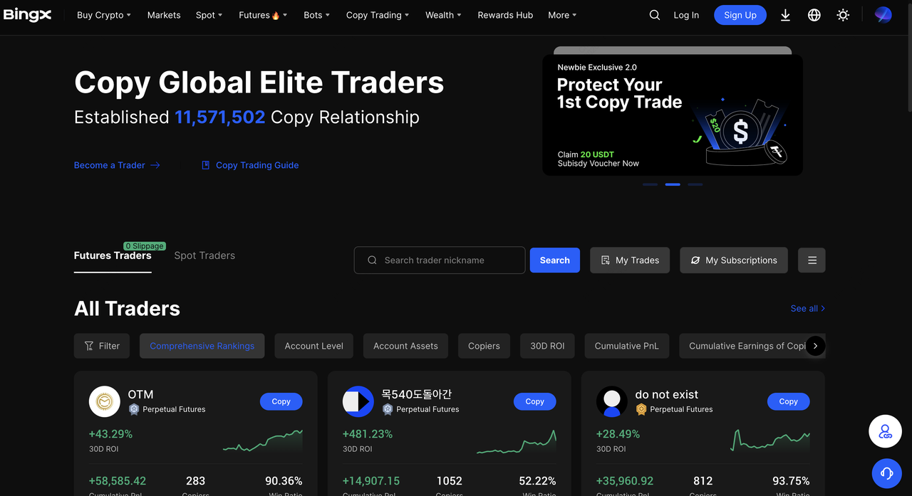 BingX занимает место ведущей биржи копи-трейдинга для новичков в 2026 году, выделяясь своей ИИ-центричной архитектурой и инсайтами на основе BingX AI, которые улучшают каждый аспект опыта. Платформа поддерживает более 40 миллионов зарегистрированных пользователей с ростом 100% год к году в 2025 году, с пиковым 24-часовым объемом торгов, превышающим 26 миллиардов долларов. Ее сообщество копи-трейдинга включает более 400,000 элитных трейдеров, генерирующих совокупный объем торгов в 580 миллиардов долларов и более 1.3 миллиарда ордеров на копирование. BingX первым внедрил Копи-трейдинг 2.0 с обновленным интерфейсом, упрощенными рабочими процессами и продвинутой кастомизацией.