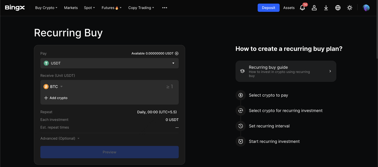 4. Розгляньте регулярну купівлю для довгострокового накопичення. Замість майнінгу або на додаток до нього, ви можете налаштувати план усереднення вартості (DCA) на BingX, щоб автоматично купувати BTC за графіком, який відповідає вашому бюджету та толерантності до ризику.