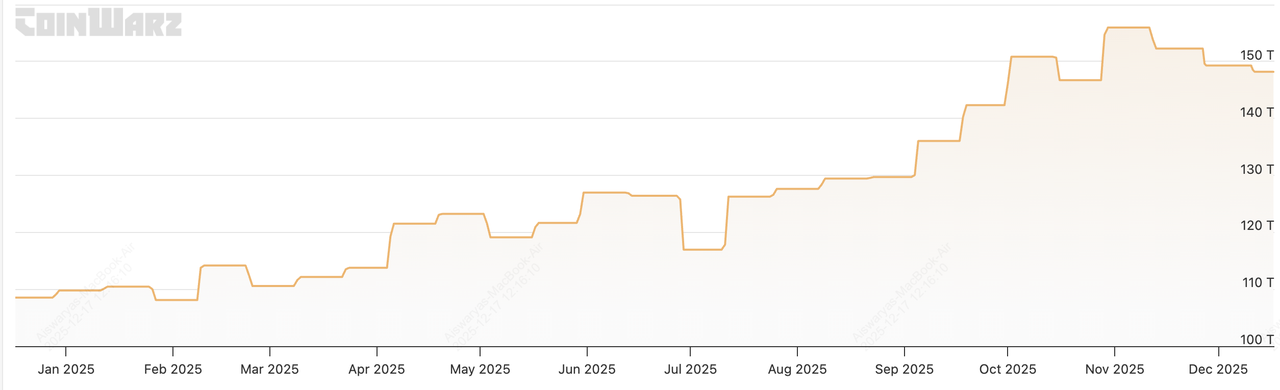 • Складність майнінгу: 148,20 трильйона, збільшення на 25% порівняно з 2024 роком, що робить майнінг блоку складнішим, ніж будь-коли.