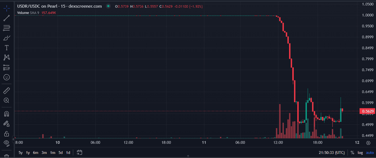 1. Шок ліквідності: Це відбувається, коли сплеск погашень виснажує резерви стейблкоїна або пули ліквідності в мережі, тимчасово штовхаючи його ціну нижче $1. Наприклад, USDR впав приблизно до $0,51 у жовтні 2023 року після вичерпання його ліквідного буфера DAI під час масових виведень.
