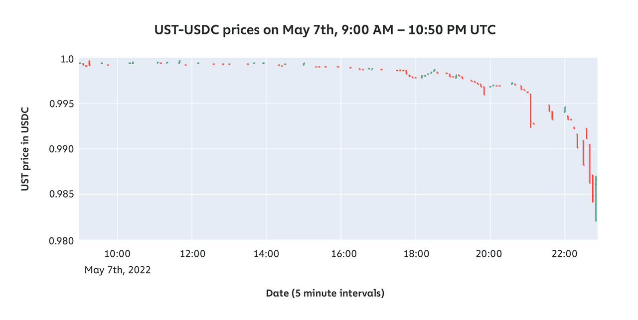 3. Збій механізму: Алгоритмічні стейблкоїни залежать від внутрішніх механізмів карбування та спалювання, які можуть вийти з ладу, коли погашення прискорюються, що призводить до спірального падіння системи. Найвідомішим прикладом є Terra UST, яка обвалилася в травні 2022 року, знищивши десятки мільярдів, оскільки її механізм прив'язки зламався.