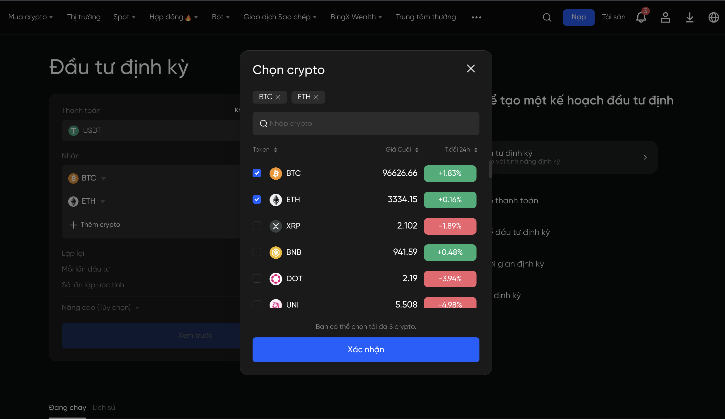 Bạn có thể thiết lập Đầu tư định kỳ cho BTC, ETH và hầu hết các loại crypto được niêm yết trên thị trường Spot của BingX, chọn tối đa năm token cho mỗi kế hoạch để đa dạng hóa các giao dịch mua tự động của bạn.