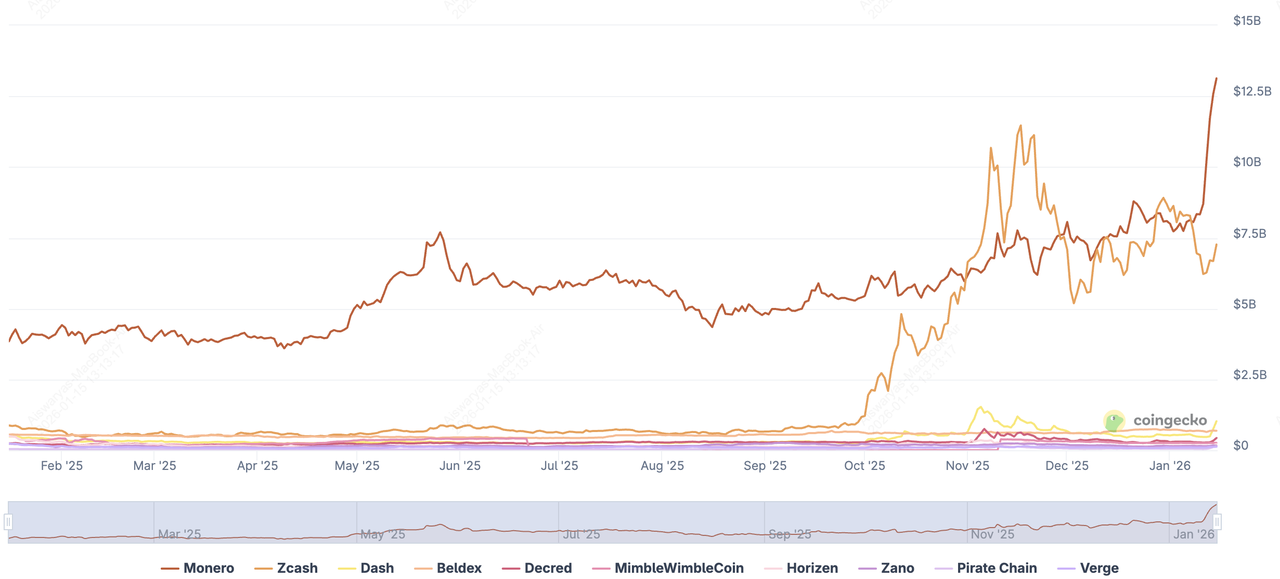 隱私型加密貨幣在2026年再次成為焦點,該類別背後擁有真正的流動性。CoinGecko的隱私幣類別顯示,截至2026年1月,市值約為235億美元,每日交易量達數十億美元,突顯隱私不再是小眾敘述,而是一個活躍交易的板塊。