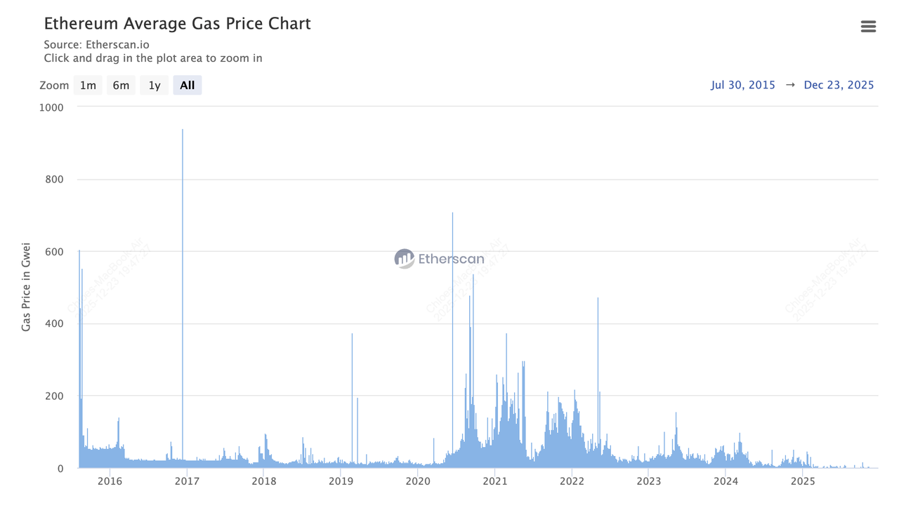 以太坊上的Gas價格主要以每Gas單位Gwei衡量,這允許用戶設定他們願意為每個計算工作單位支付的金額,較高的價格會激勵驗證者更快地處理交易。在2021年EIP-1559升級之後,Gas價格由網路根據需求自動調整的基礎費用和可選的優先費用或小費組成,其中基礎費用會被銷毀以減少ETH供應,從而產生通縮壓力。歷史數據顯示,平均Gas價格波動劇烈,從網路平靜時期標準轉帳的10-30 Gwei低點,到網路擁堵時期的200 Gwei以上高峰,但在2025年,Dencun升級後平均價格已穩定在3 Gwei以下,目前最低可達0.034 Gwei。