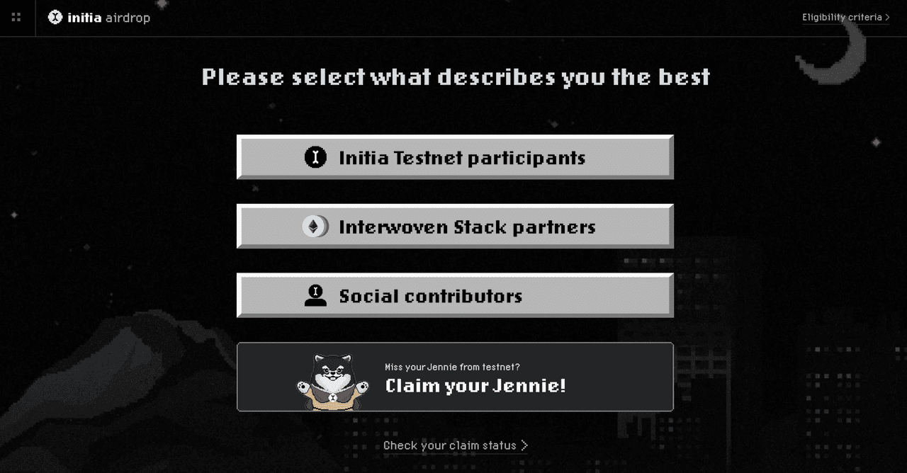 Initia 的空投是根據來自不同社群和合作生態系統所採取的多次快照進行分配的。如果您符合資格,主網啟動後將有 30 天的時間可透過官方領取網站領取您的代幣。