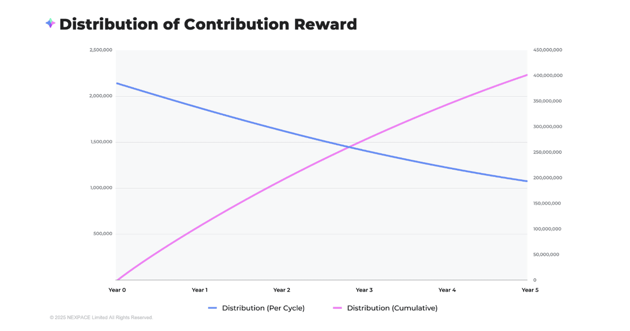 NXPC 的總供應量為 10 億枚,其中絕大多數將分配給推動生態發展的貢獻者。相較於一次性釋出或初期銷售,NXPC 採取長期線性釋出的發行機制,隨時間逐步進入市場流通。這種漸進式發行曲線有助於維持稀缺性、支持可持續成長,並強化參與者對生態系統的長期信心。